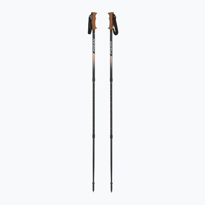 I bastoni Fizan Tierra sono un modello unico con impugnatura in sughero. Da chiusi misurano solo 63 cm, mentre da aperti raggiungono i 140 cm. Sono composti da tre sezioni (18/16/14 mm) e pesano 226 g. Dotati di sistema di regolazione Flexy, rondelle da 50 mm e punta metallica con protezioni.