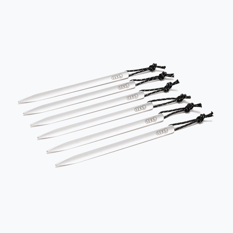 Le Stake Tarp ENO 6 pz. sono elementi leggeri e resistenti per fissare un tarpa o una tenda. La struttura in alluminio si mantiene bene sul terreno, e le corde riflettenti facilitano il loro ritrovamento e utilizzo al buio.